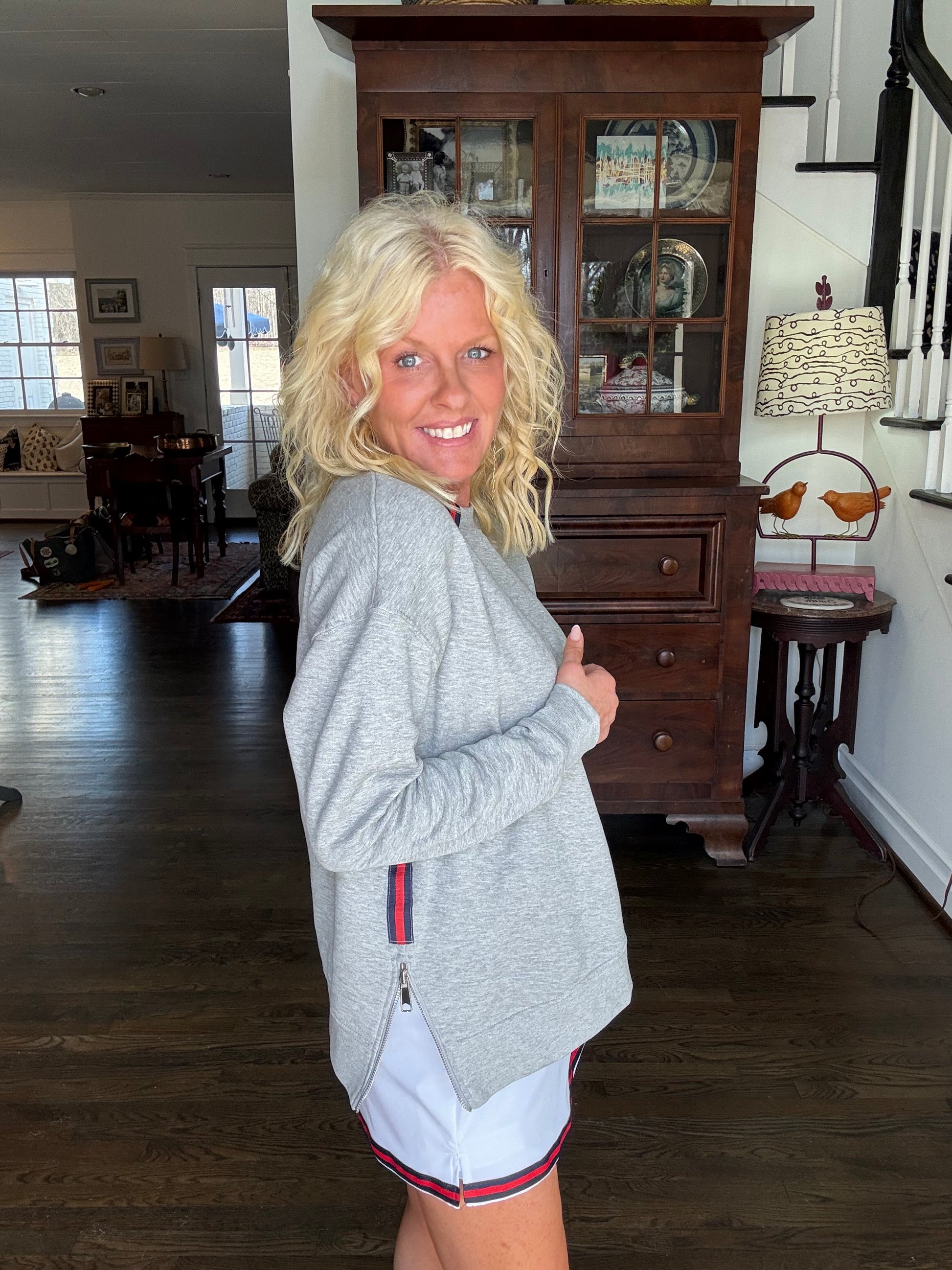 This is an amazing sweatshirt. It’s so cozy. It has zippers on the side. Size up.