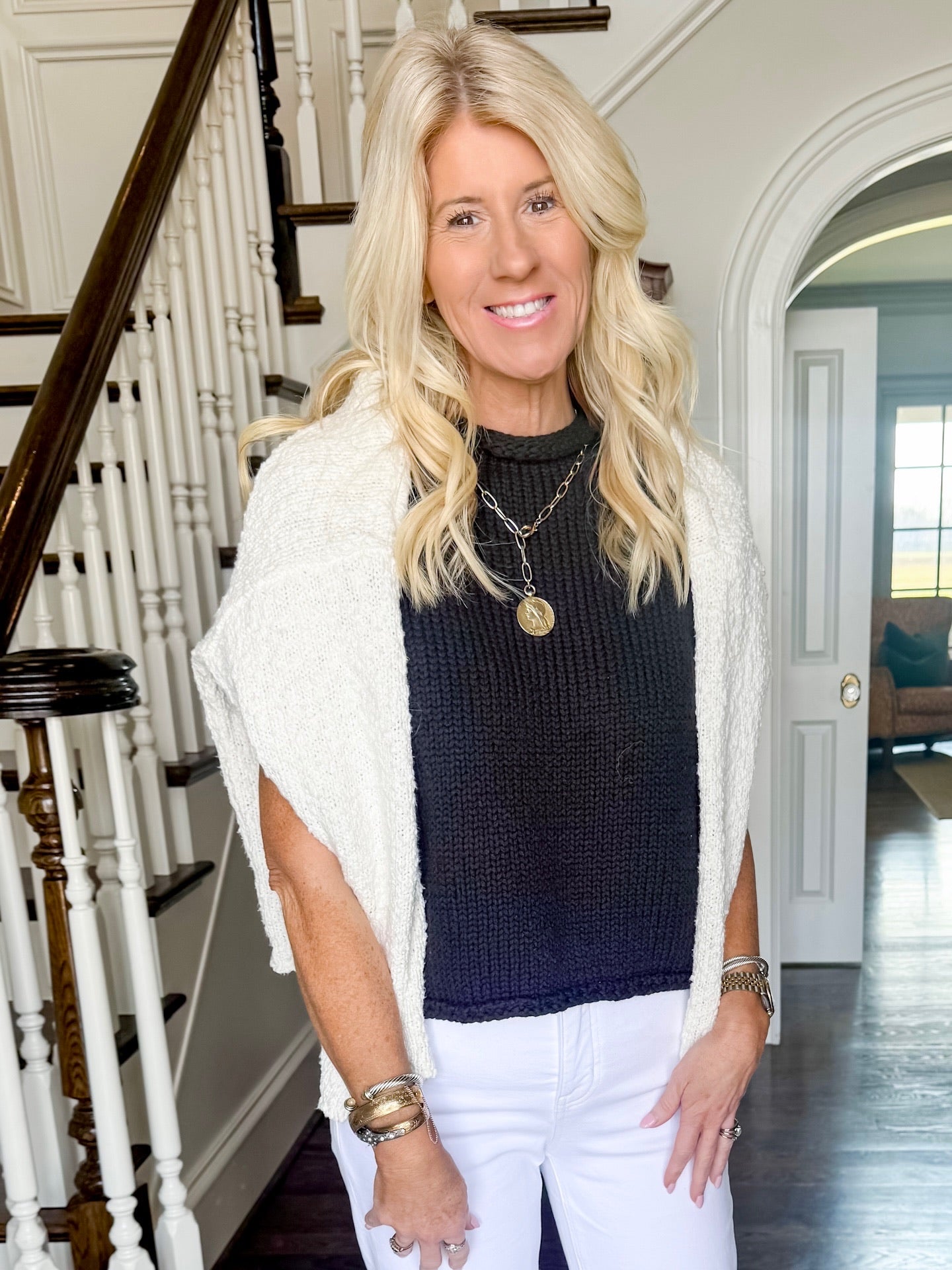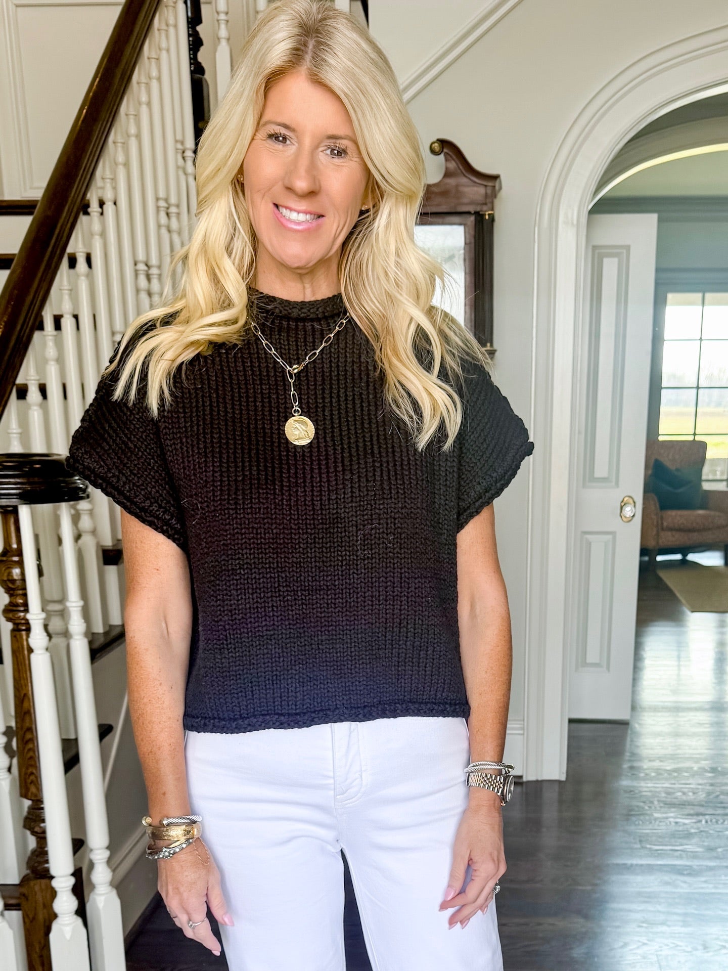 One of our favorite pieces is a short sleeve, summer sweater. Lightweight but still full of rich texture, this slightly raised collar and a bit of a flare sleeve is such an statement for this solid, classic black. We love the length, you don’t even have to tuck it in. Throw a sweater over your shoulders for now and wear it by itself when it is warmer. We are obsessing over this piece paired with our new white denim. Runs true to size. Model in a small.