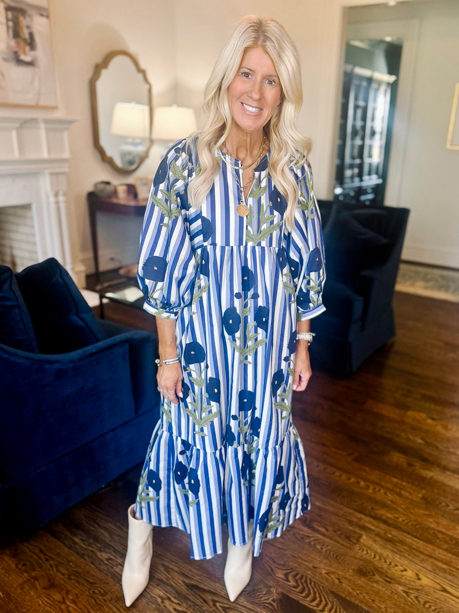 Love this maxi length statement dress in a stunning cobalt blue stripe and floral print with a. Three quarter sleeve. Details at the cuffs and tassels. Lined. Runs true to size. Model wearing a small.