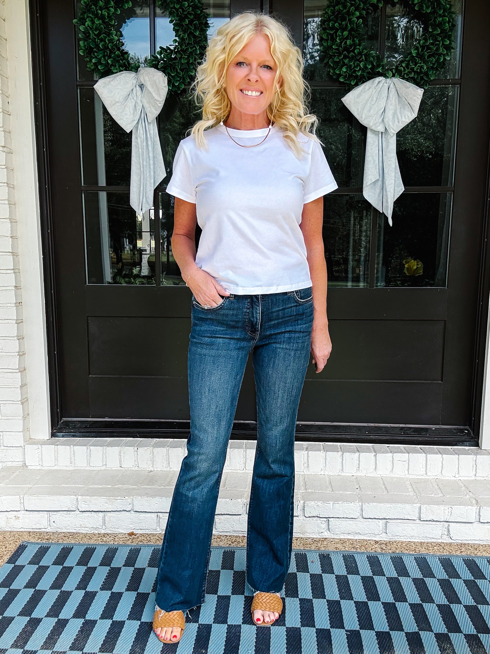 New KUT style. A kick flare fit. Raw hem. Ankle length (not cropped). Stretchy waist. Dark wash. Run true to size. Model in a 0.