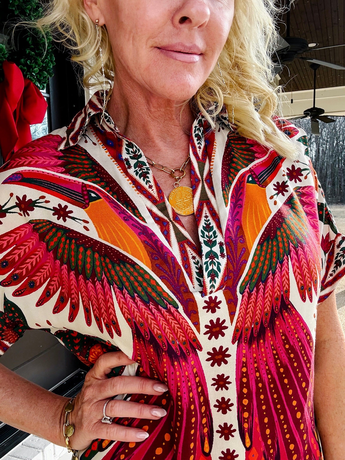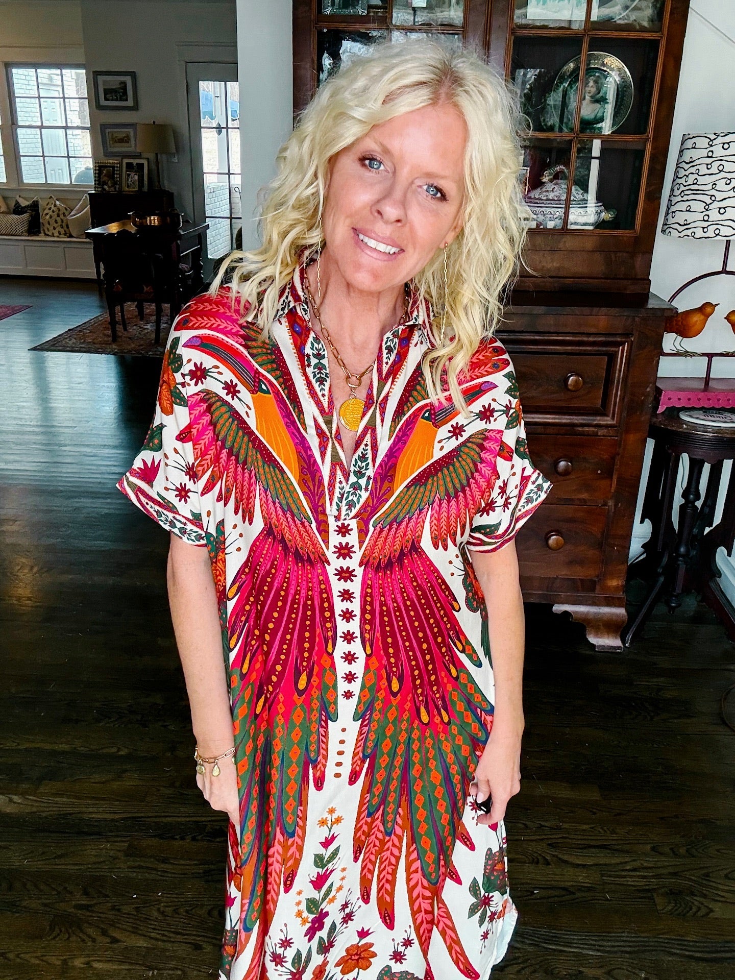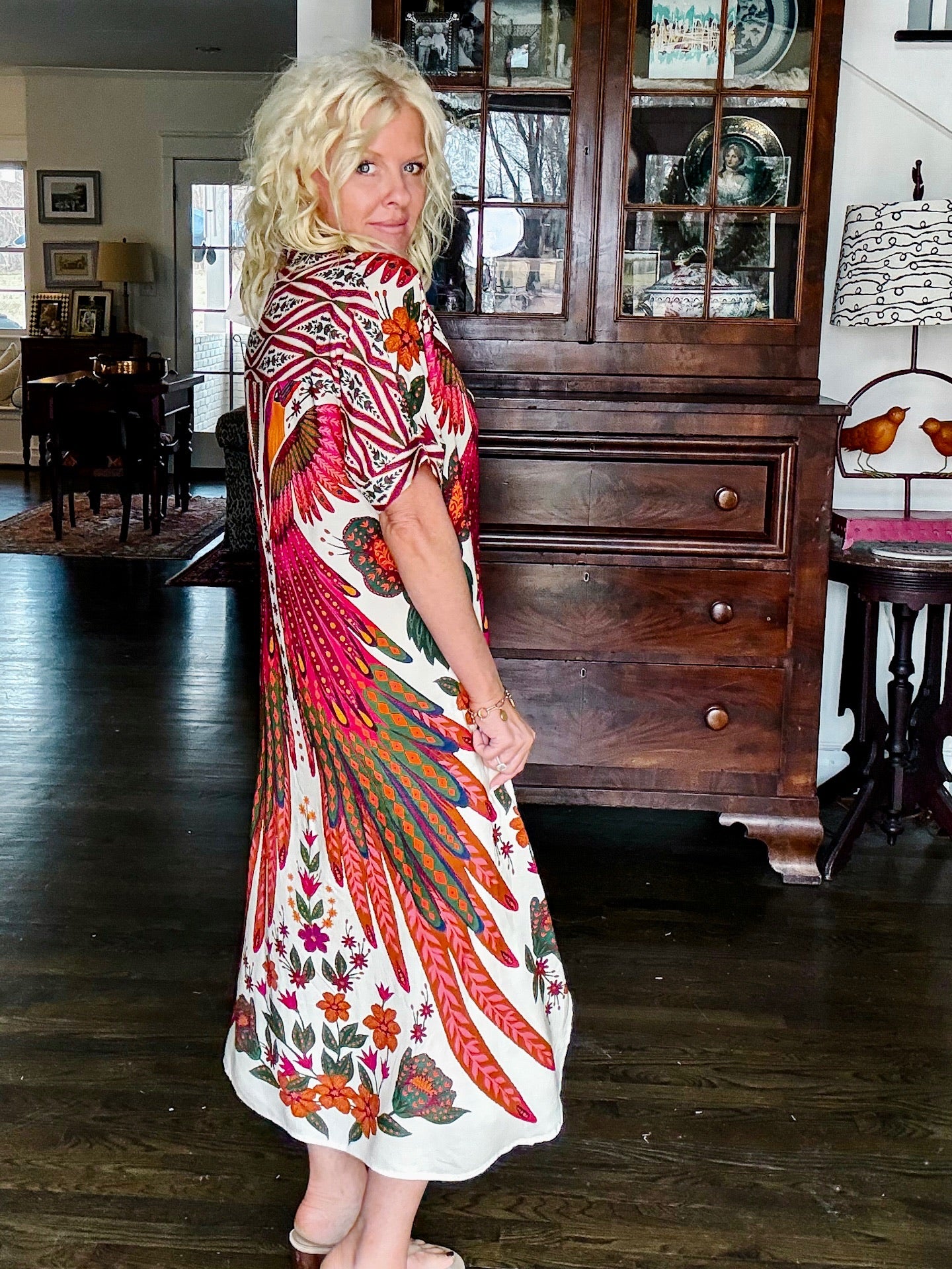 This high-end, designer inspired dress is such a great fit. It shows off the figure but is still flowy. The color palette is Rich and looks so expensive. We love the print. This button button down style midi length dress runs true to size. Model in a small.