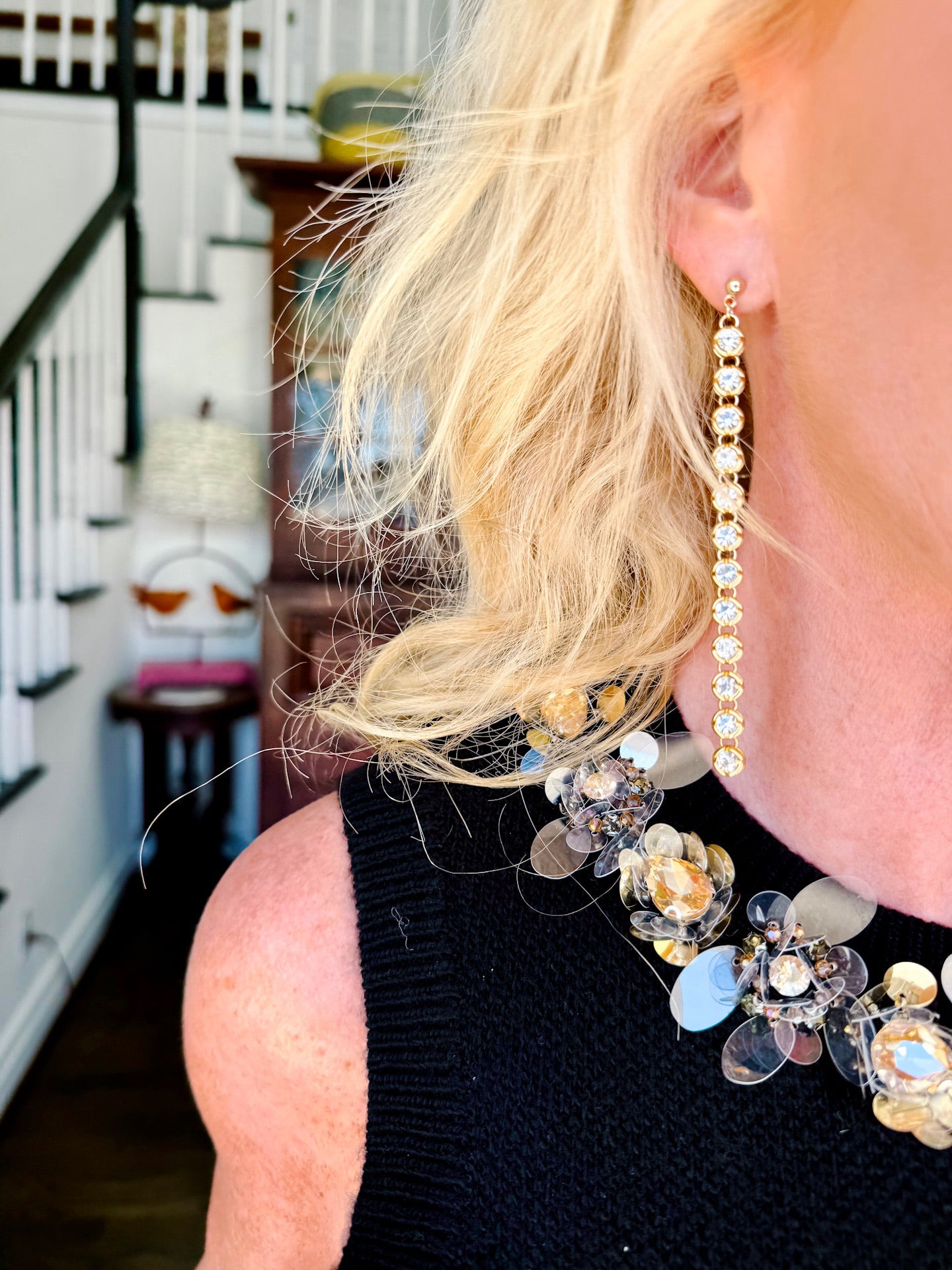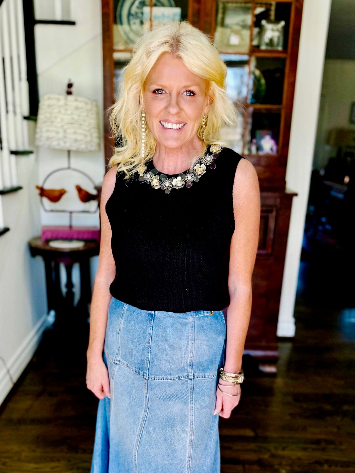 English Factory brand, black sleeveless sweater top. Rich fabric. Gorgeous floral embellishment at collar make such a statement. This will turn heads and get lots of compliments. 60% nylon, 35% acrylic, 5% wool. Runs true to size. Model in a small.