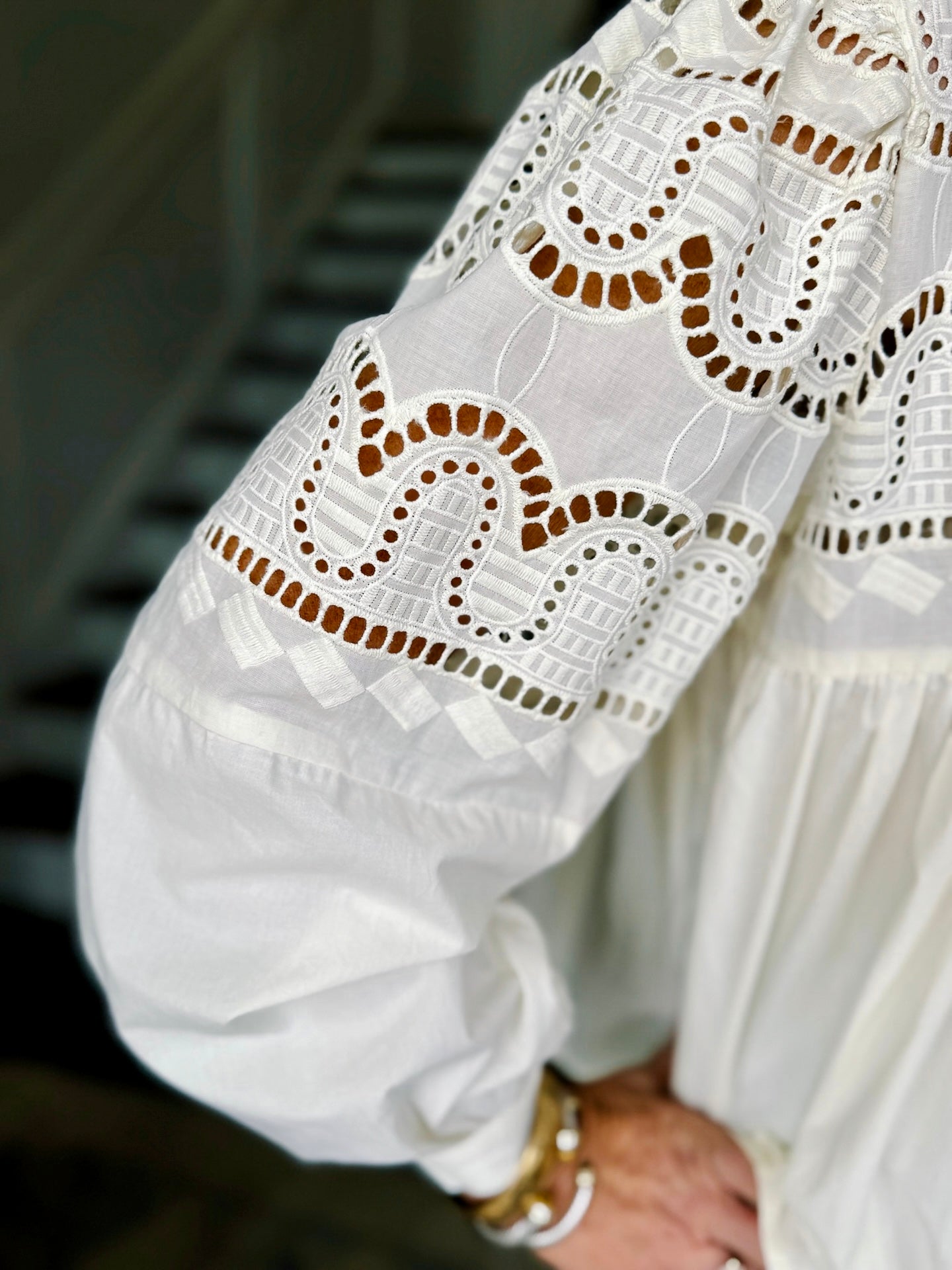 Light weight long sleeve embroidered top in a gorgeous cream shade. Embroidery at the top, on the back and on the sleeve. Perfect with jeans now and shorts later. 100% cotton. Runs true to size. Model in a small.