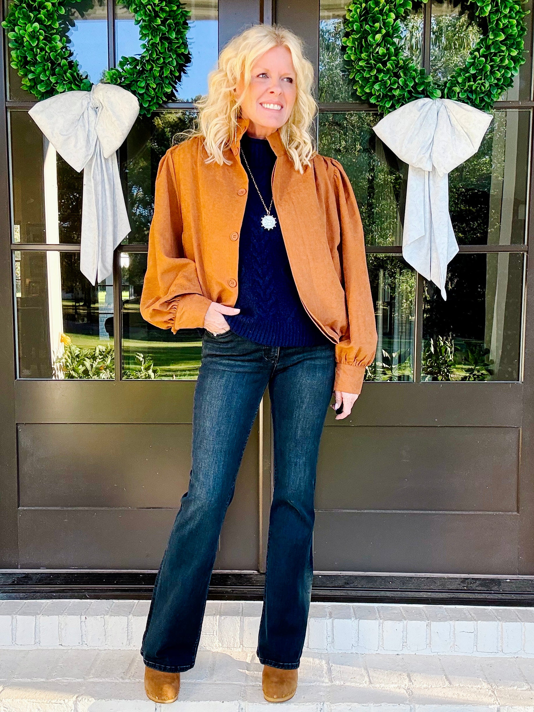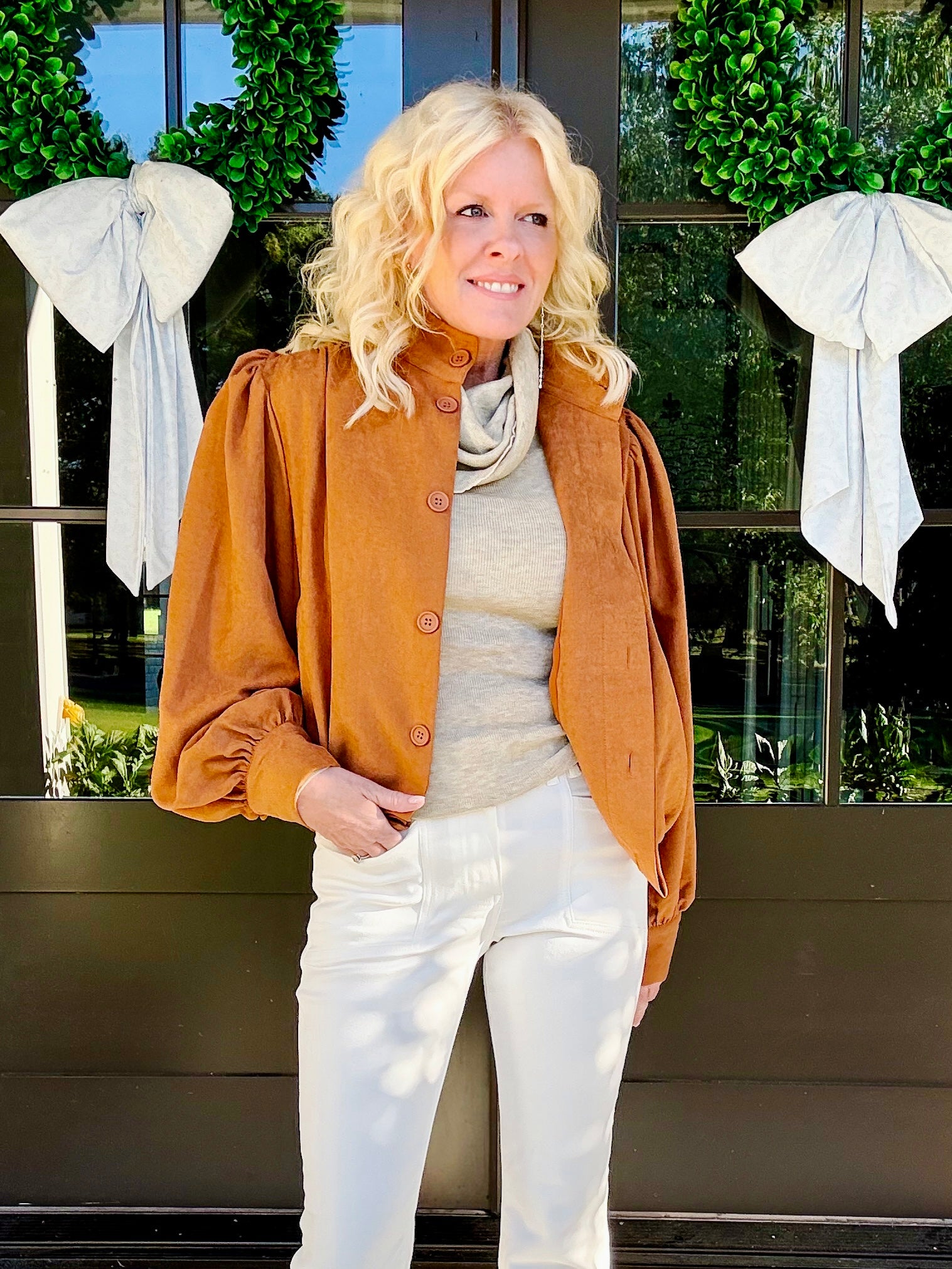 Suede feel. Gorgeous camel shade. Perfect for all things fall. Bubble style bottom. Wear over anything. Runs true to size. Model in a small.