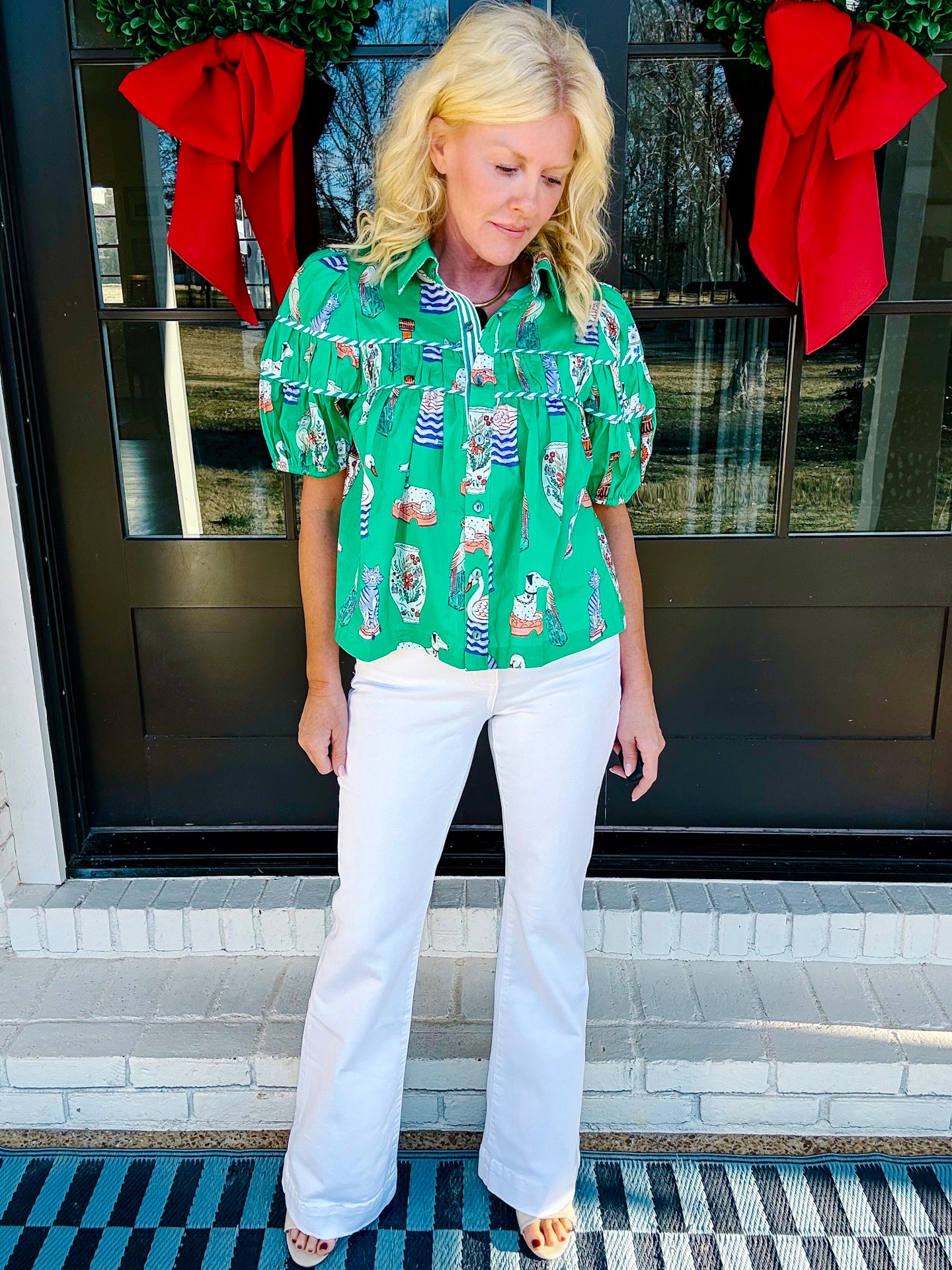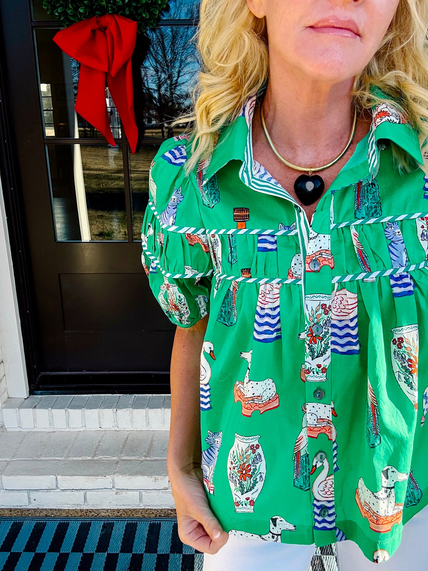 This fun, unique button down, baby doll top in Kelly green is so ornate and full of detail. All of the southern charm wrapped in one piece with pattern, color, and lots of print. Runs true to size. Model in a small.