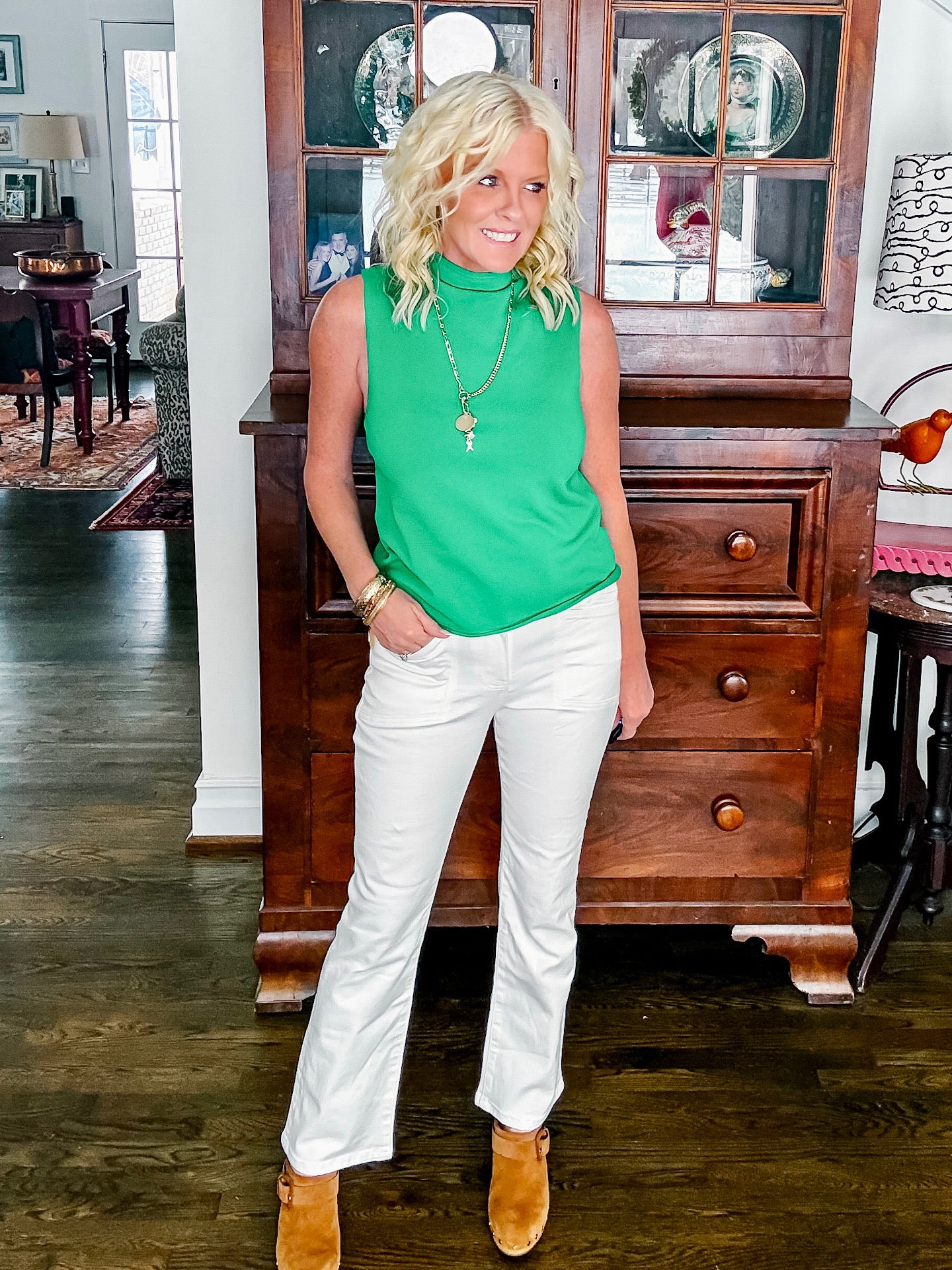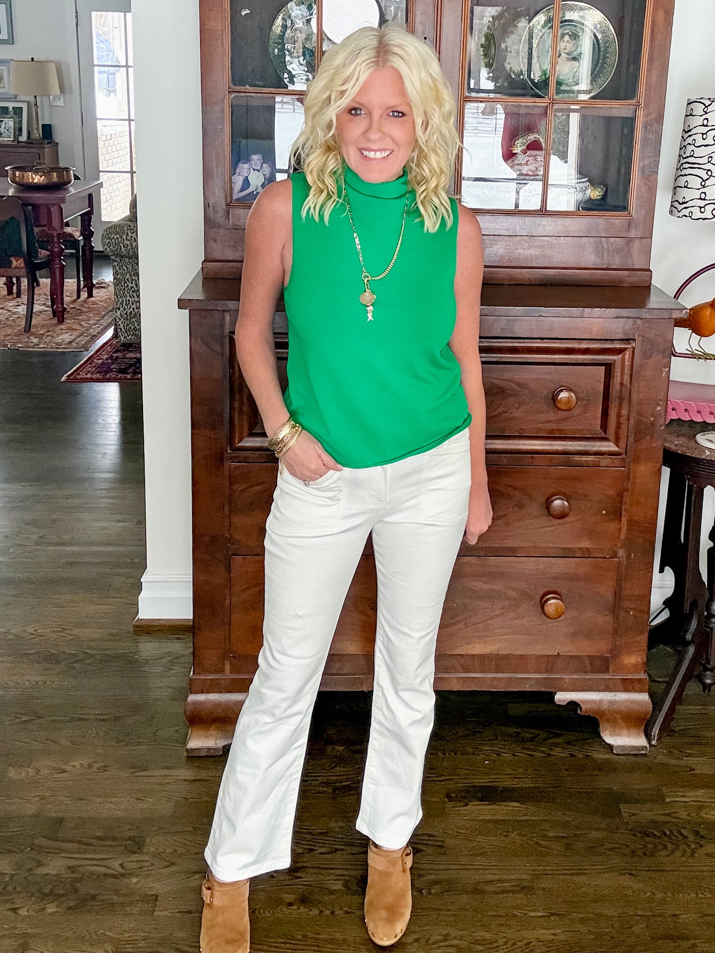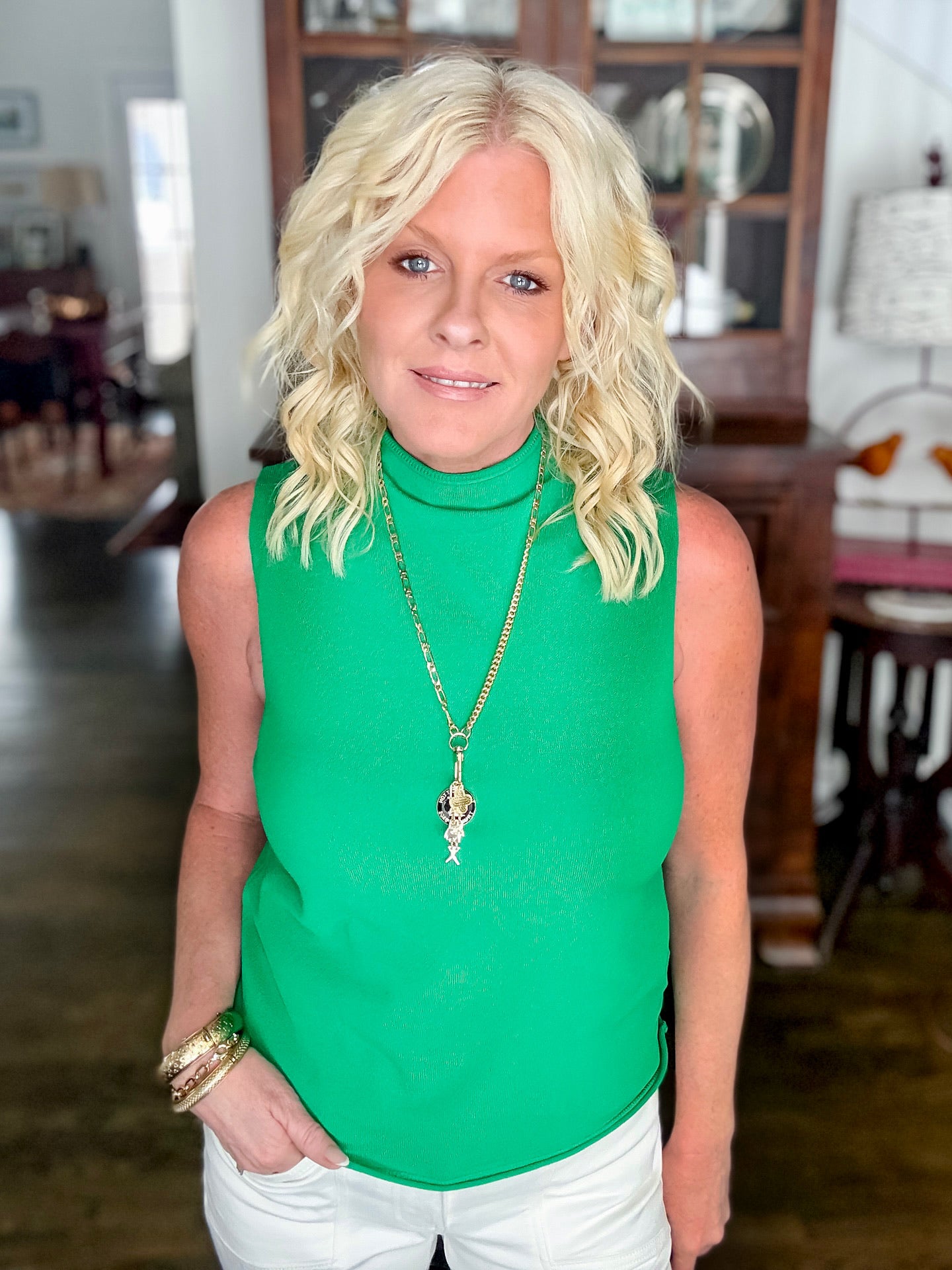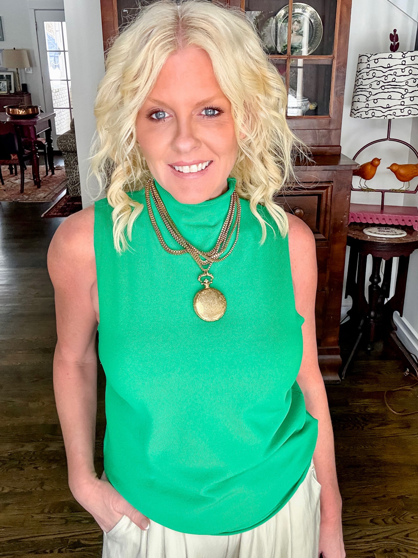 Sleeveless green, mock turtleneck. 80% viscose, 20% nylon. Runs true to size. Model in a small.