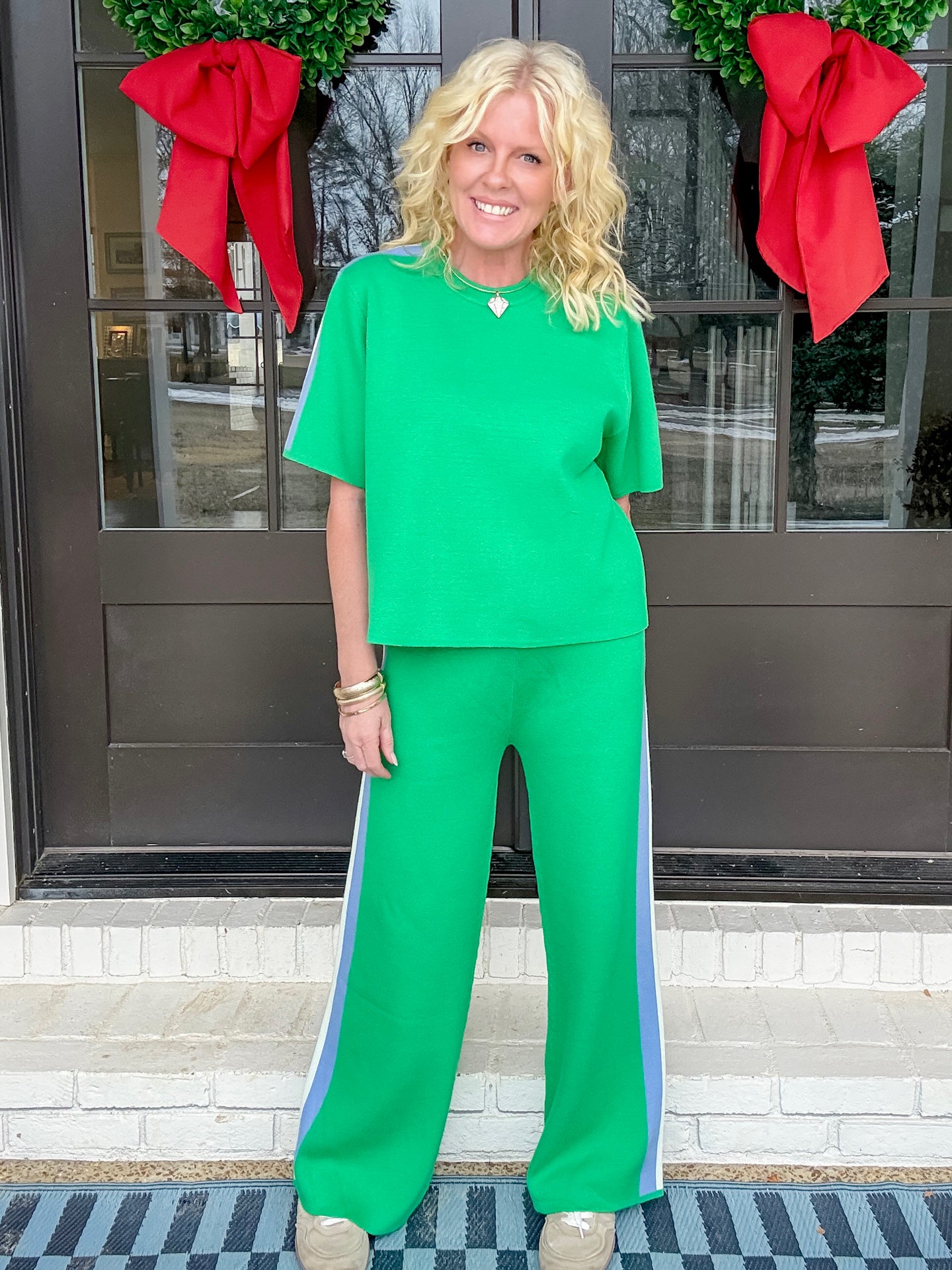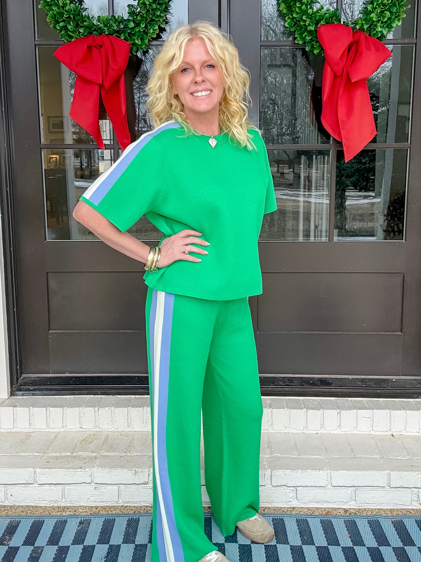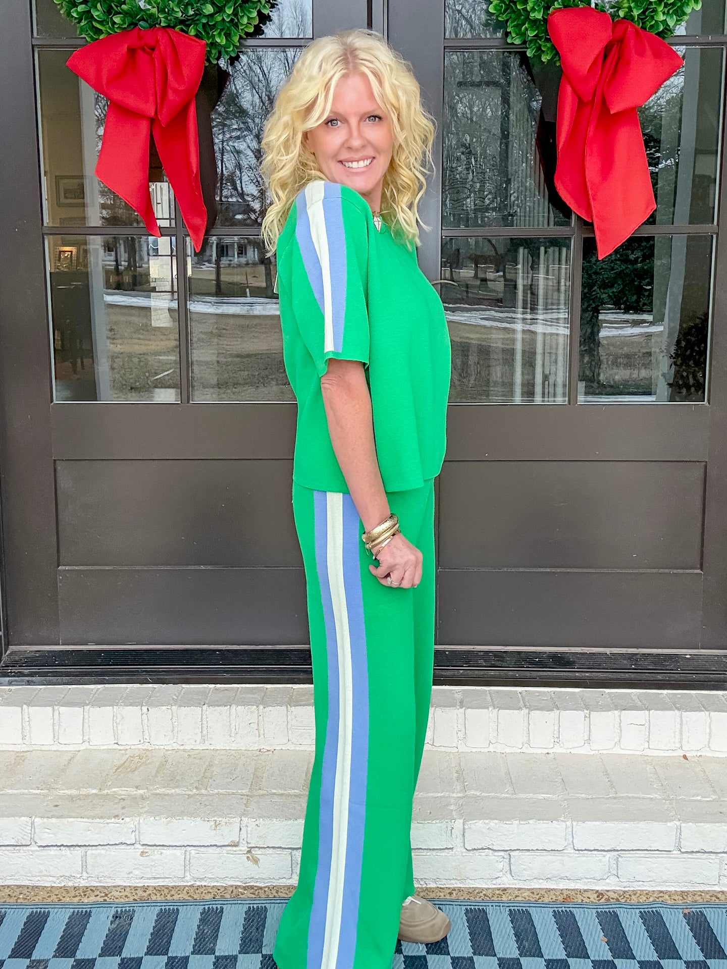 This set is the most comfortable thing we’ve ever had. It’s a pull on waistband. It fits perfectly. True to size. It’s a great weight but completely breathable. So good for the spring.