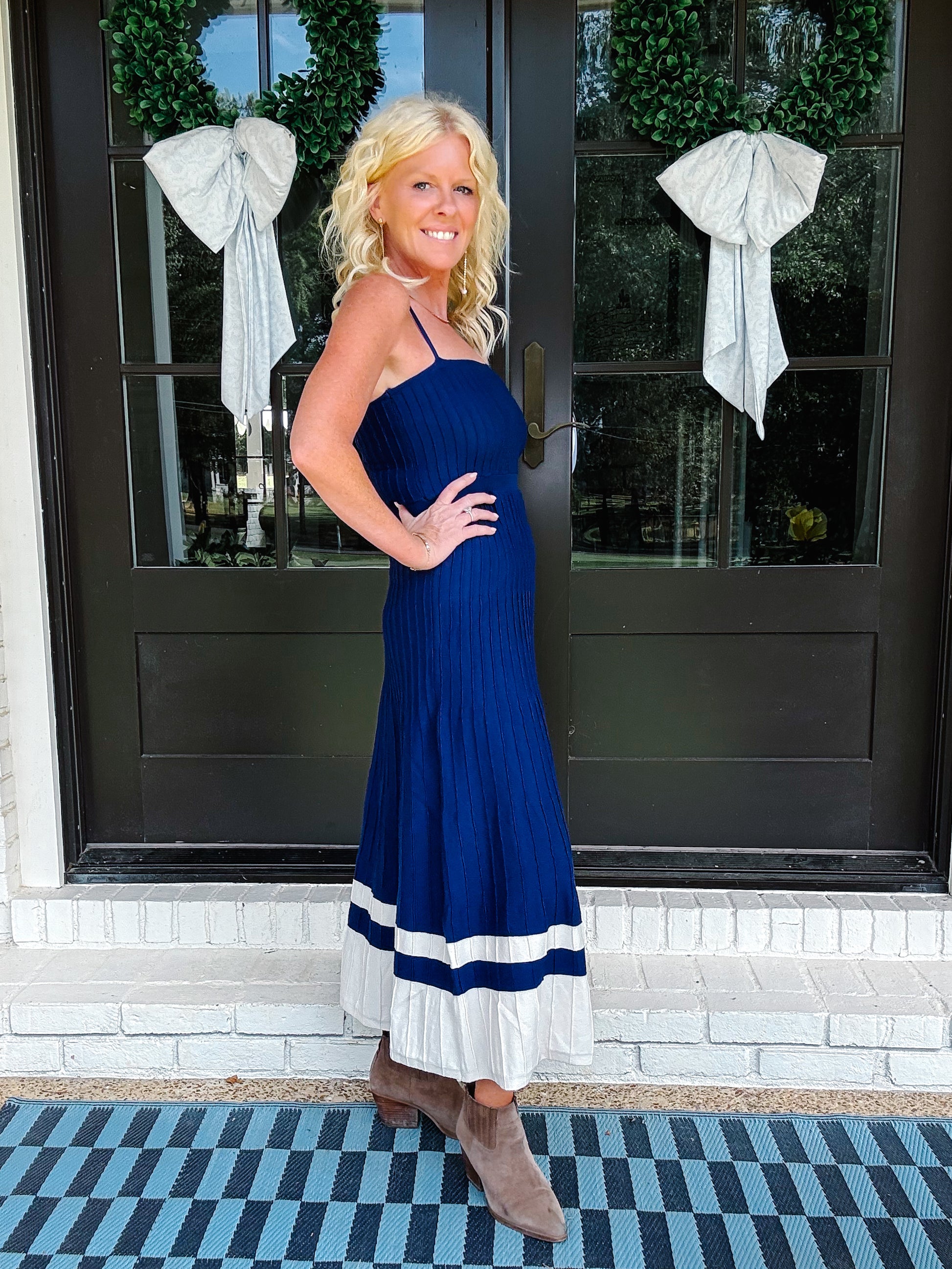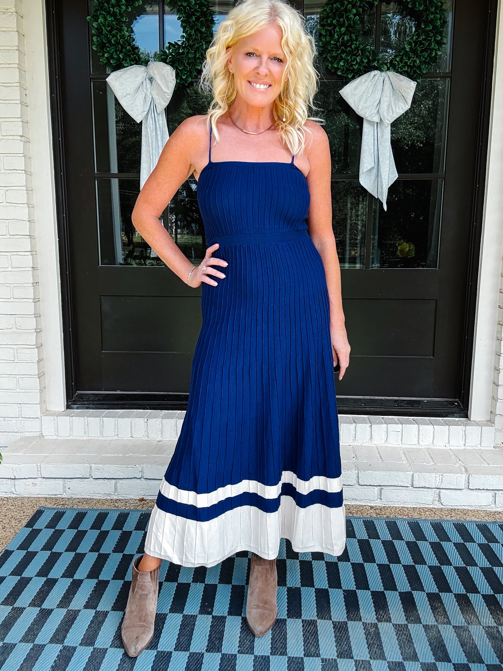 Knit sweater fabric. So rich looking. Super high end. Spaghetti strap style. Accordion pleat at the bottom. Contrasting off white color block. Game day or any day. Form fit. Runs small. Size up one. Model in medium.