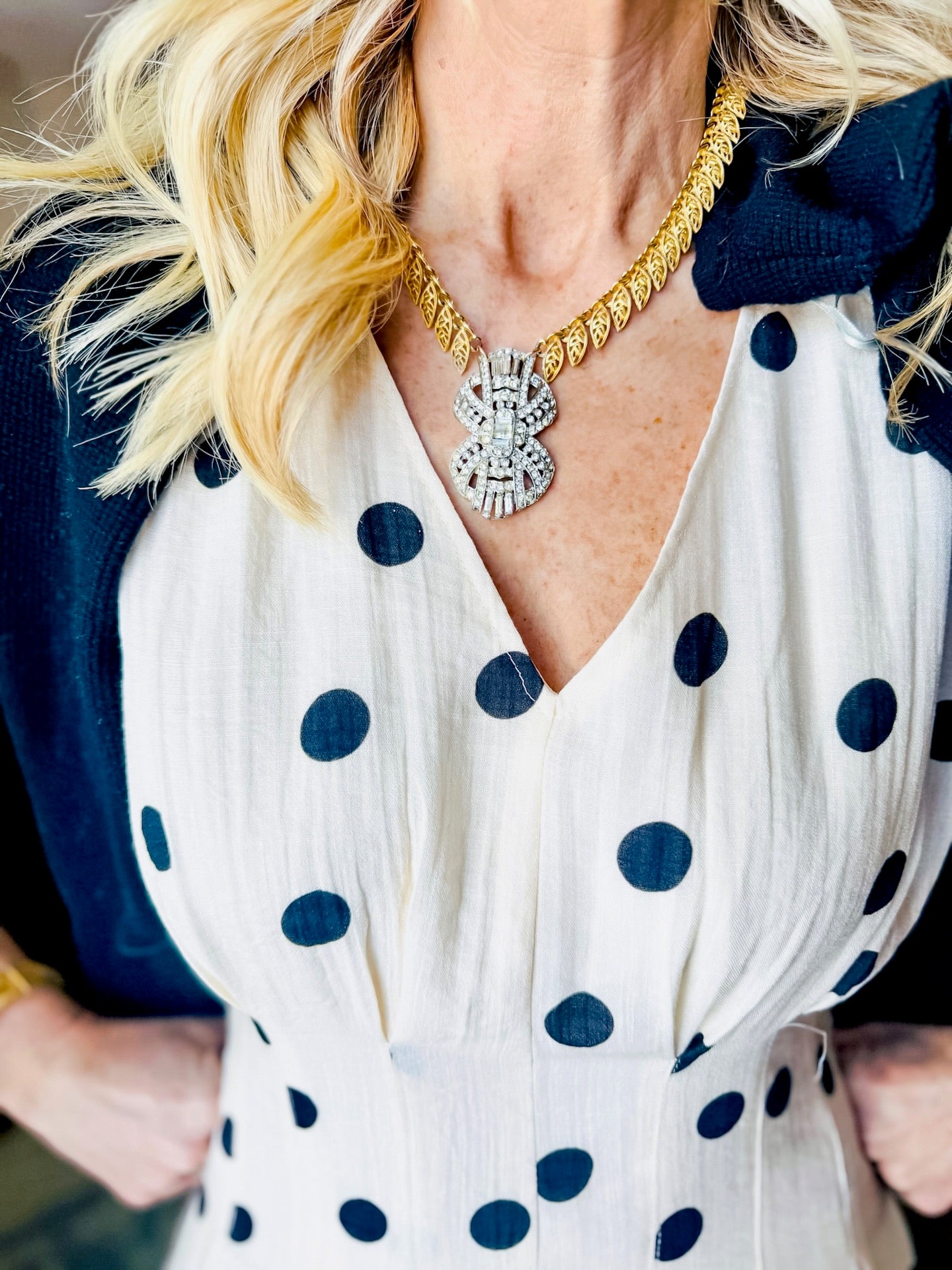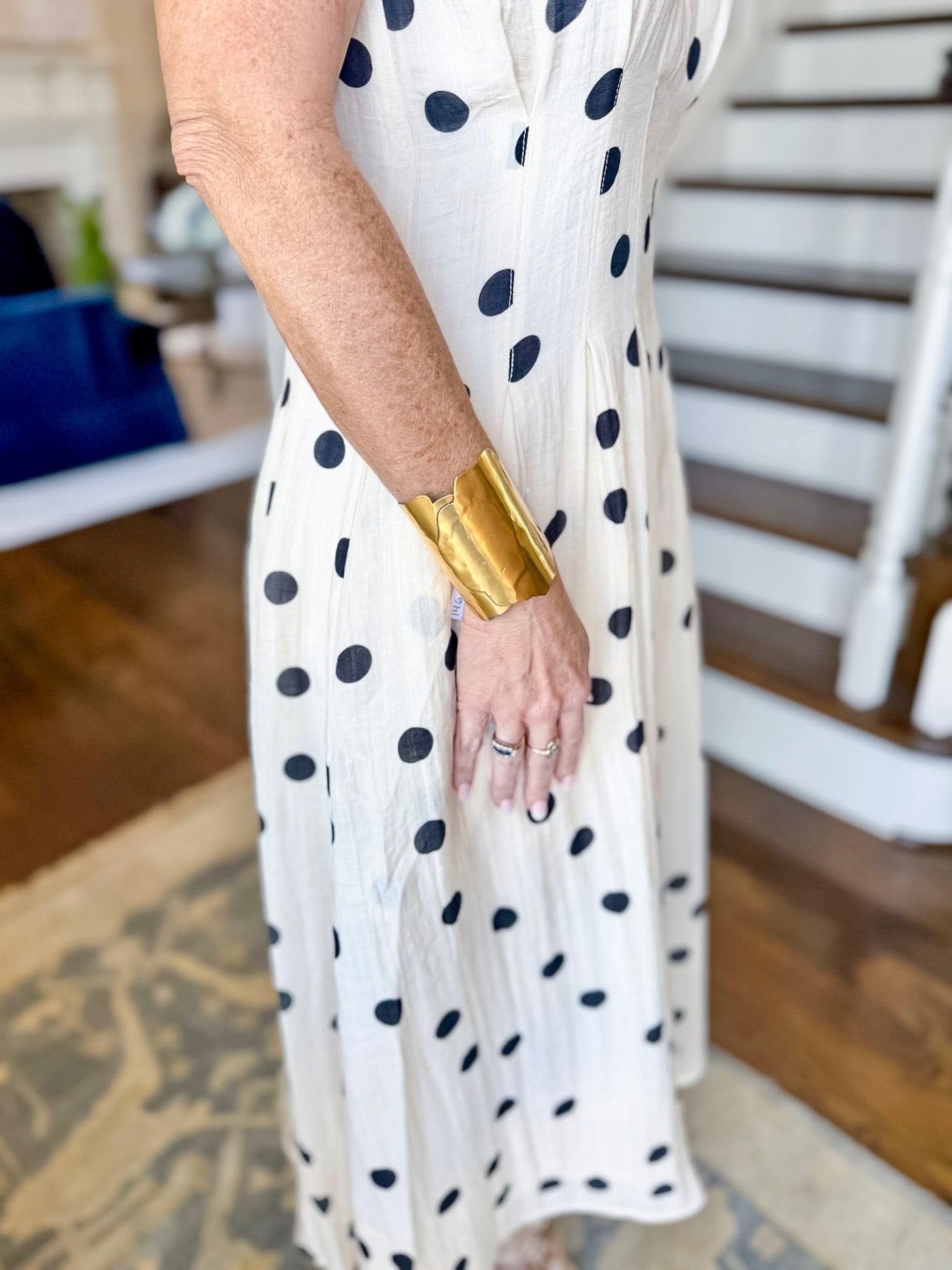 THML off white, v Neck, dress with black classic polka dots. Zips in back. Lined. Has pockets. Runs true to size, forgiving at the top. Model in an extra small.