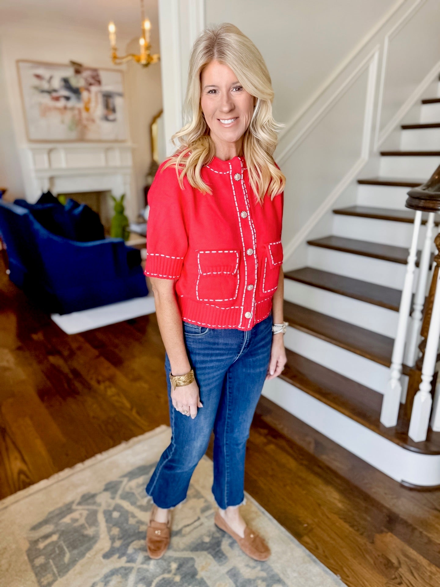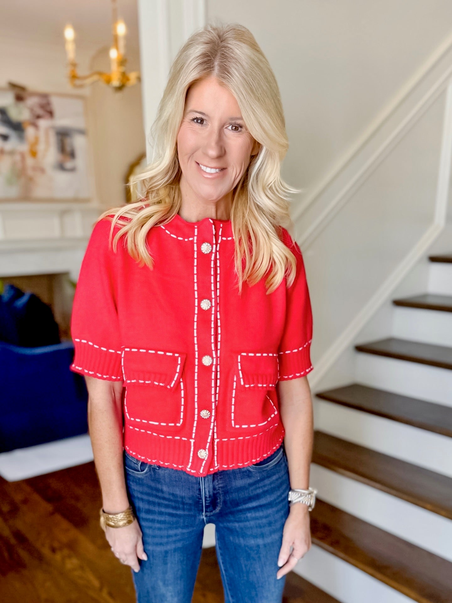 THML red, short sleeve sweater with detailed white stitching, pockets, and intricate gold button embellishment. Can be fully unbuttoned if you would like to wear it also as a cardigan sweater with a tank. Polyester/nylon blend. Runs true to size. Model in an xs.