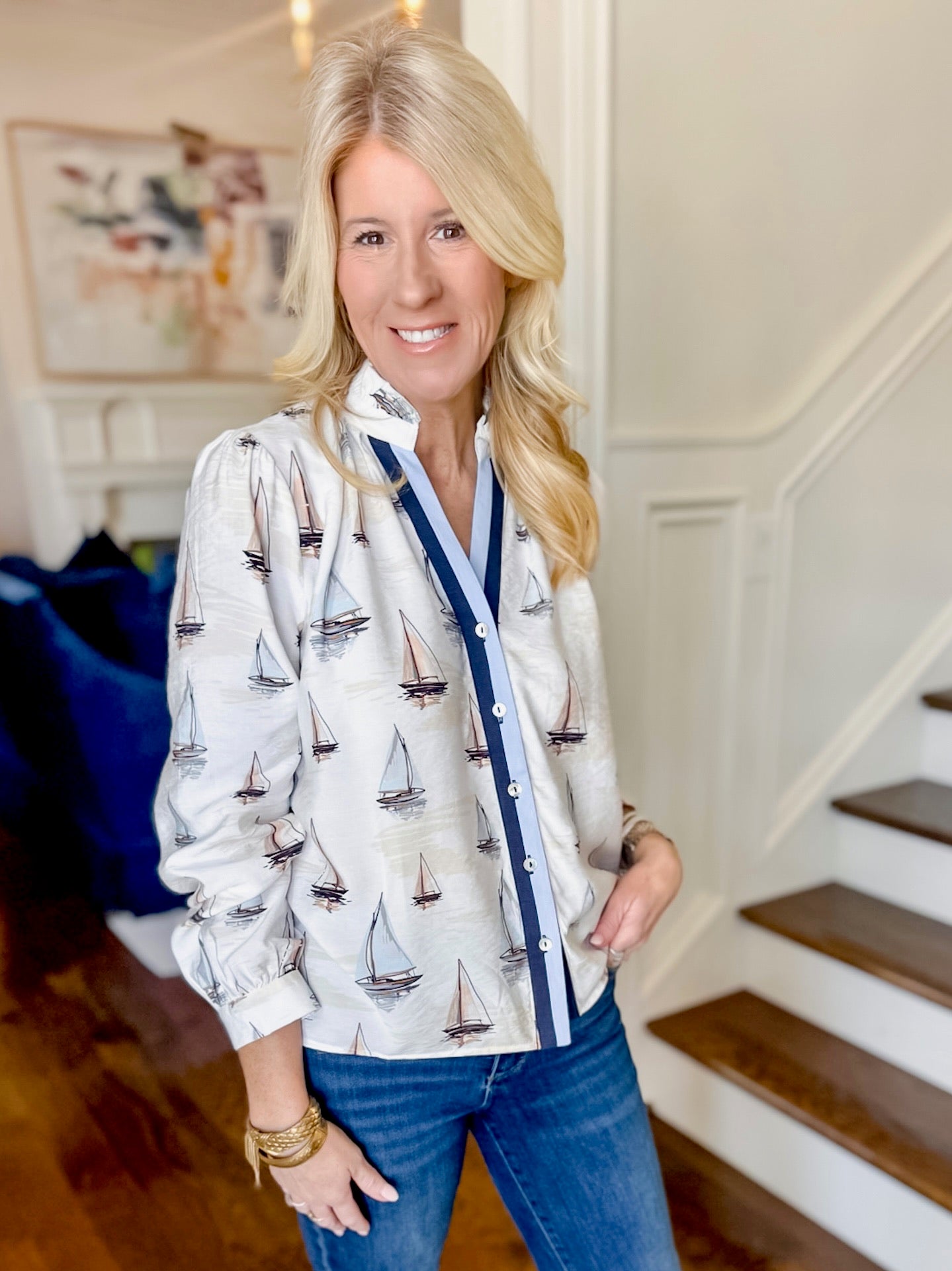 THML Button-down blouse. Mandarin collar. Sailboat print. Creams, navy, sky blue, taupe color. Cotton blend. if it’s true to us. Model in an extra small.