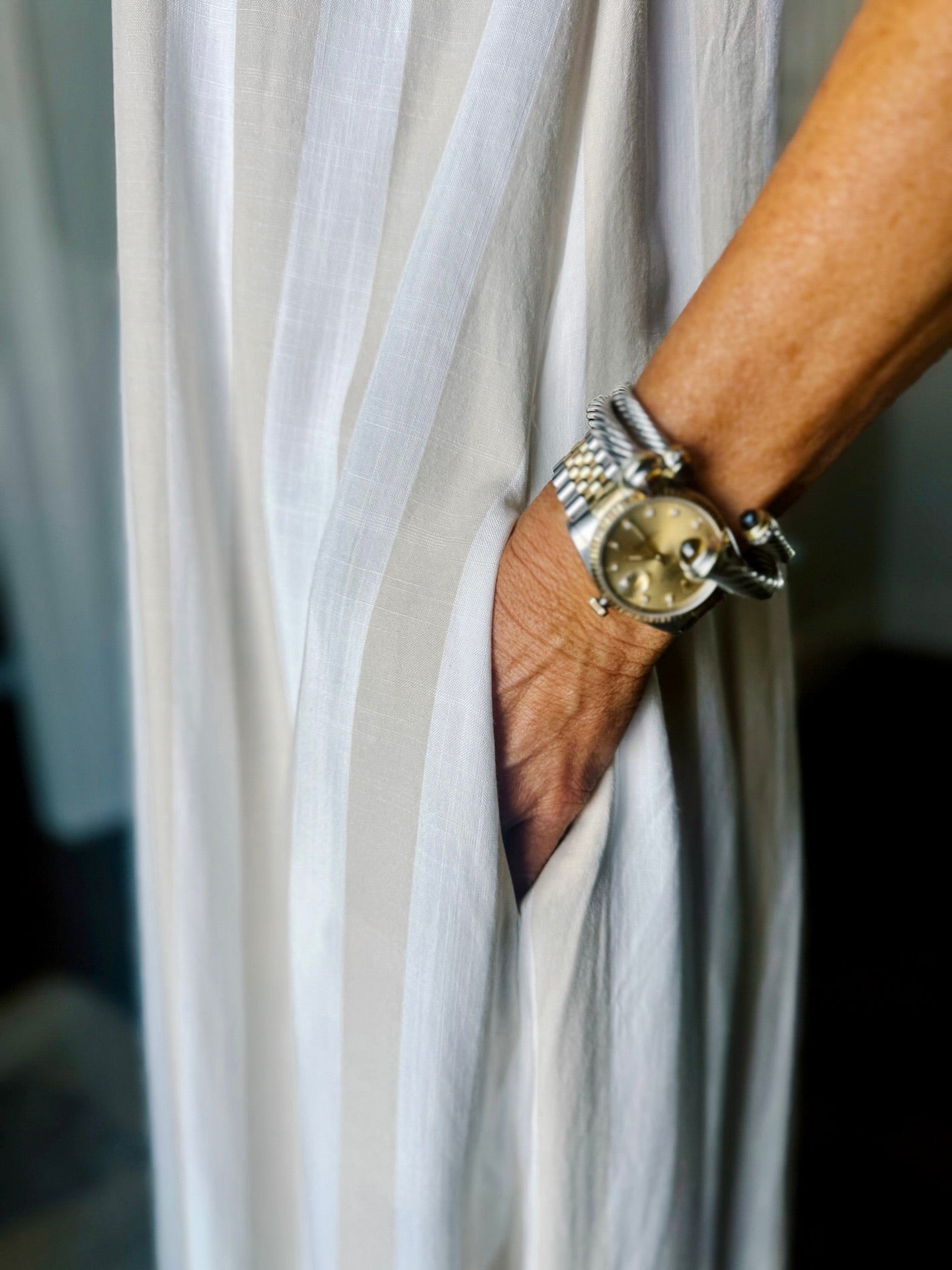 The perfect, classic maxi dress is here with a gorgeous stripe in white and taupe shades and embroidery at the halter neck line. True long maxi length. Runs true to size. Model in a small.