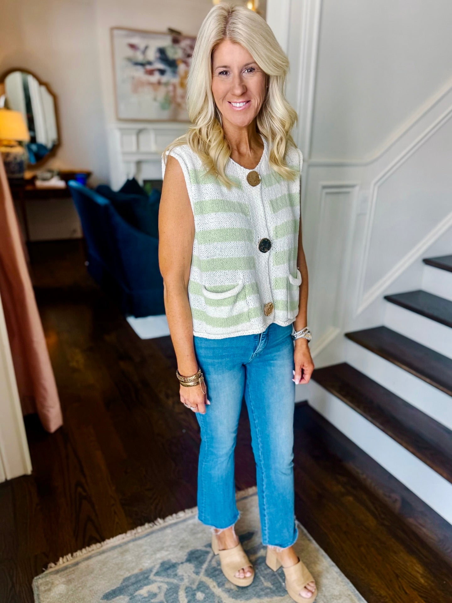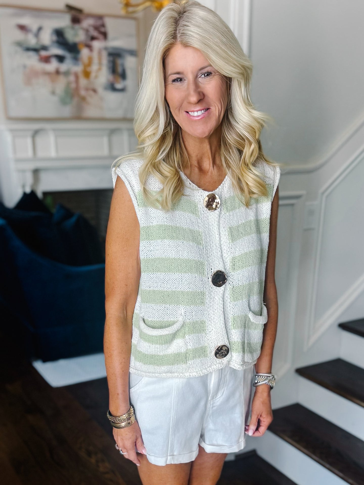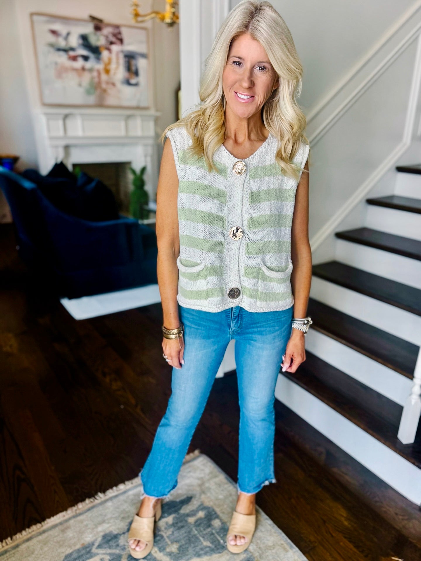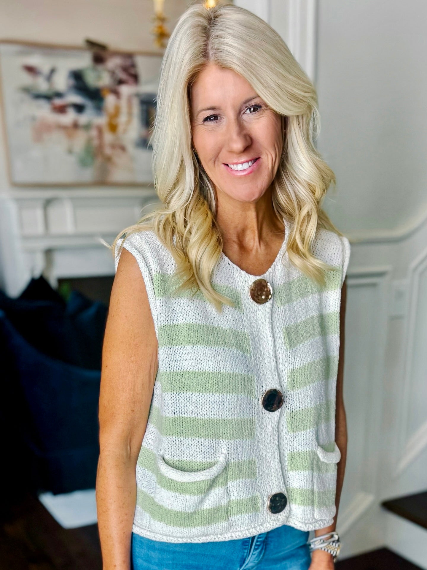 Lightweight sweater. Sleeveless. Large gold button detail. Color block like green shade. Runs true to size. Model in a small.
