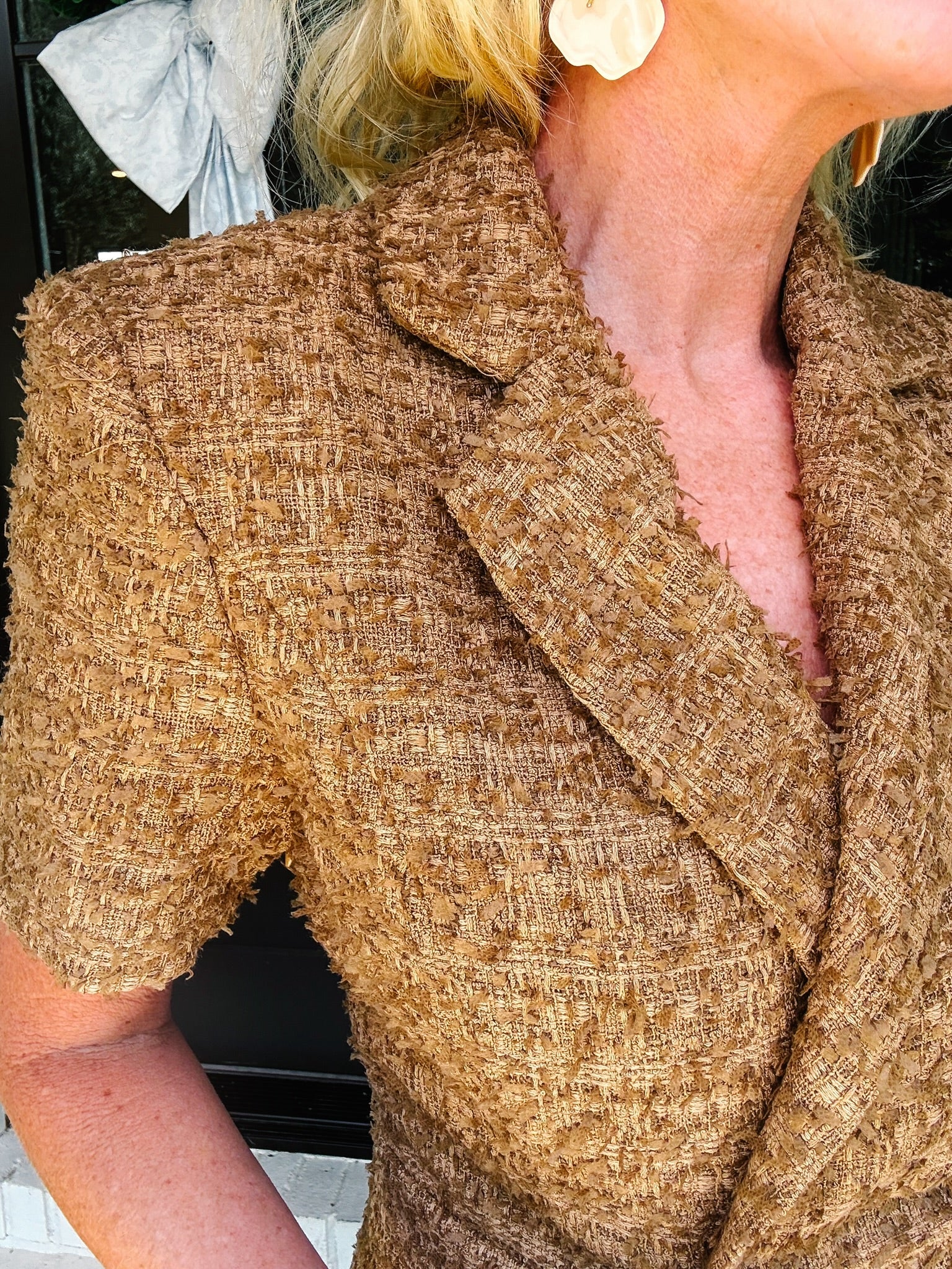 This Short Sleeve Tweed Romper is an ideal choice for a stylish modern look. Crafted from a tweed material this piece features a classic blazer-style romper in a gorgeous caramel brown with short sleeves and a wrapped design. It's perfect for a range of classy occasions. Runs a size small. We recommend sizing up one.